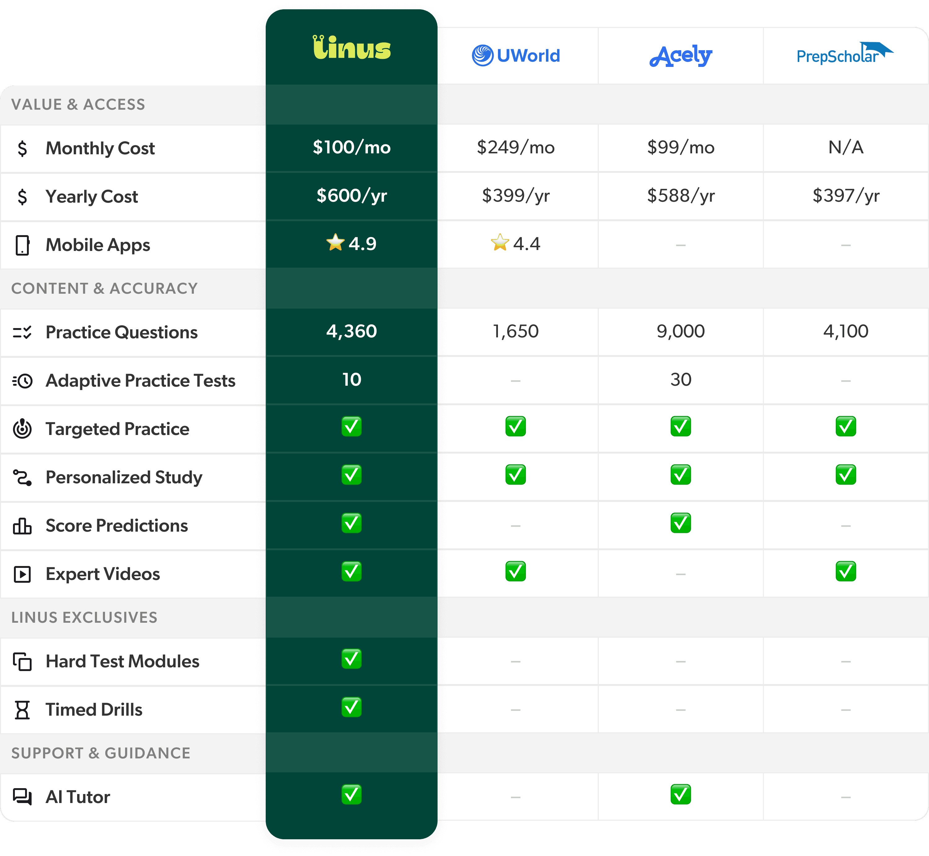 No AI slop here, guaranteed. We use AI as a tool, but the real magic comes from our human experts—every one of our thousands of questions (and growing) is meticulously written and vetted by our perfect-scoring content team (no 1590s allowed). And since Linus was built from the ground up exclusively for the new Digital SAT, our questions aren't just 'adapted' from an old textbook. They are a perfect match for the real exam's format, style, and difficulty.