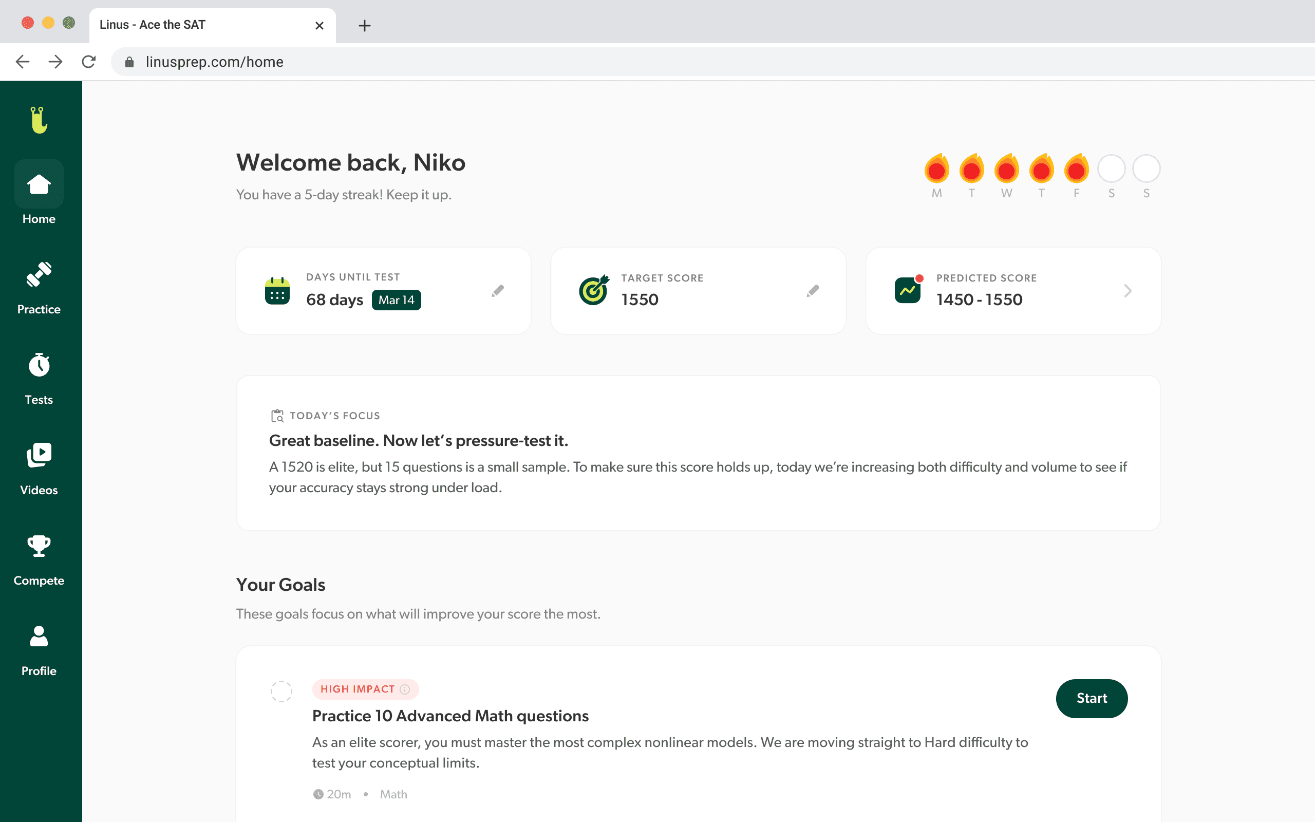 Great question! We're huge fans of Khan Academy—it's an amazing, massive free library. But that's just it: it's a library of content. Linus is a product laser-focused on one thing: getting you a higher SAT score. Our platform is hyper-personalized to your specific needs, whether you're just starting or already at 1500+. We're not a pile of 'one-size-fits-all' videos; we're an adaptive, gamified system (with 4.9-star mobile apps!) designed to build a daily study habit that delivers real results.